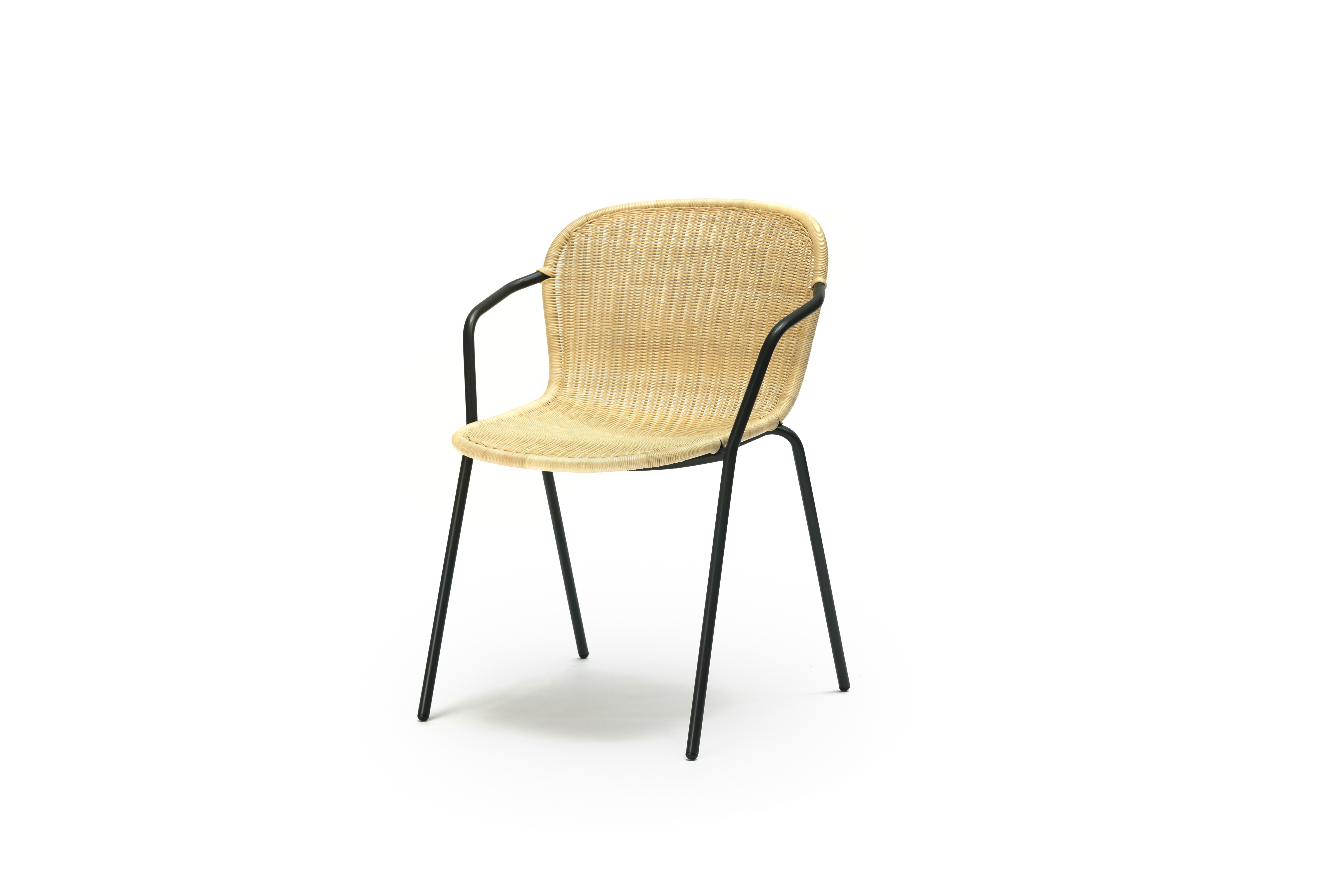 Elliot is a stackable dining chair suitable for indoor and outdoor use. Its gently shaped back offers comfort and embraces the body, while the armrest complements the curved back, creating a visually appealing front and back view of the chair.